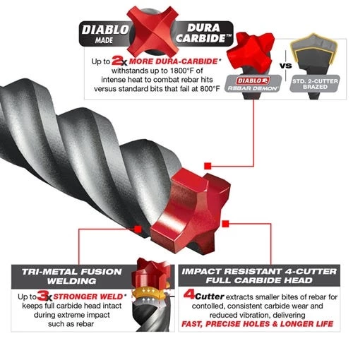 Diablo 1/4″ x 4″ x 6″ Rebar Demon SDS-Plus 4-Cutter Full Carbide Head Rotary Hammer Drill Bits (Box of 25) DMAPL4070-P25